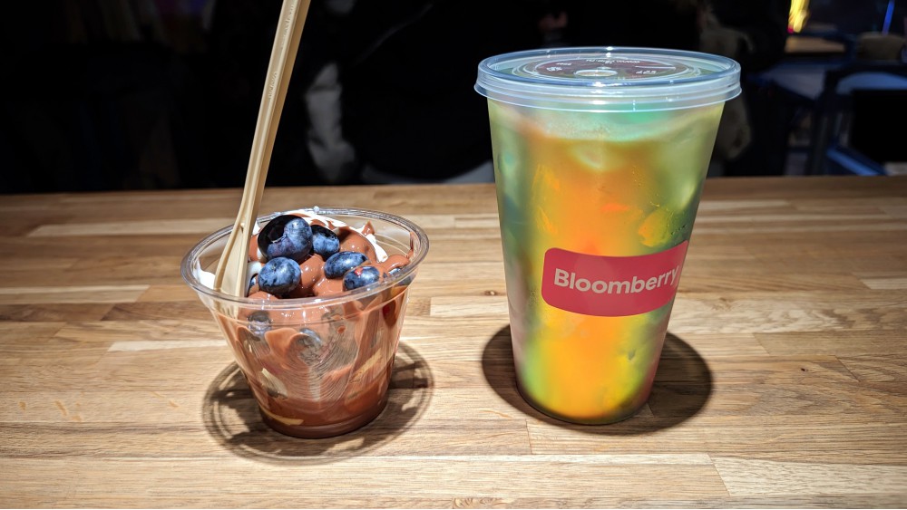 У нас премьера! В районе центрального острова-бара открылся клубничный, если смотреть на оформление стойки, или всё же надобно описать длиннее — ягодный или десертный бар «Фрукты в Шоколаде Bloomberry». Шесть вариантов десертов в стаканчиках и напитки, холодные и горячие, на ту же тему. Это я описал меню: и на экране, и, как люблю, два печатных варианта справа и слева, не занимать место у кассы.