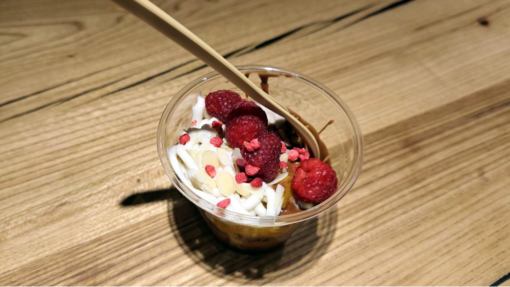 Клубника-голубика-банан (580 за маленькую порцию). Возможно, дело в форме кусочков банана, целых ягодах клубники и приятно кисленькой голубике меньшего размера: шоколад распределяется лучше, ровнее, и вот появляется густой и тонкий окрас, баланс со сладким. В списке меню идёт последним, а я бы выбрал первым на пробу именно этот вариант! Лучше всех отражает идею корнера, как мне кажется.