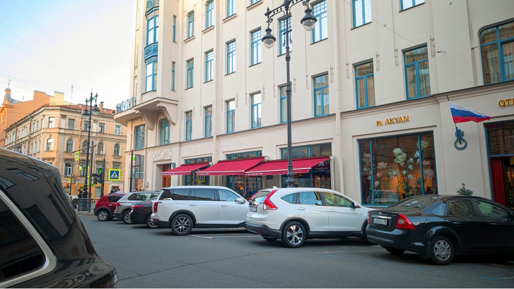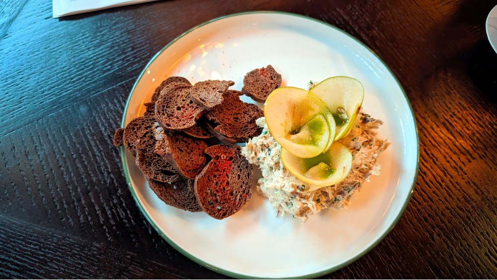 Интерьер разный, есть несколько удачных мест, но в целом мне сложно оценить эклектику. Свежо, необычно, ярко: я привык такое ценить на фоне штамповок инкубаторских. Свет «пабный», нет ни светильников на столах, ни на потолке точек, есть рассеянный поток от люстр — нельзя ругать, хоть в оригинальном, хоть в неоригинальном. Нет броней на столах, и когда гостю говорят, что нельзя сюда и сюда, чувствуешь себя... Только потом поставили бутылки на лучший стол у окна, поняв ошибку, обиду дарящую. Но, надо отметить, в не самую бойкую среду занято явно больше 2/3 одного среднего зала: команда раскрутила объект. Своего туалета, как наличествует в итальянском, нет, как и в «Серже», надо идти в холл отеля и по ступеням вниз. Вот и всё про антураж. Я просто рад, что смог зайти и сесть. Не остановлен ширмой.