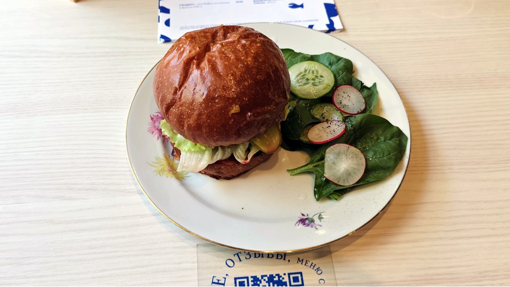 Меню текстовое, но по QR-коду доступны фото, КБЖУ и прочая прелесть. Это хорошо. «Русская северная кухня», но «Петербургский дайнер» на входе, что уже царапает мозжечок, и мак-энд-чиз с бургерами в меню! У всех блюд вес указан: чувствуется, что человек опытный. Прекрасное меню на одной странице, и если прогнать привозные десерты («Футура»-то мне зачем, я «Футуру» не аллё), вот и остаётся дюжина блюд. Впервые на Планете один салат и два бутера — это весь раздел стартов, потом два супа, пять завтраков весь день, по одному чизбургеру и сэндвичу... Мечта Бориса и реализация того, за что я боролся почти 22 года. Или, наоборот, дискредитация хорошей идеи?