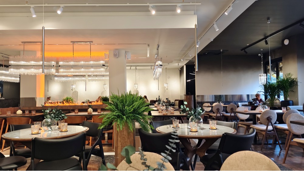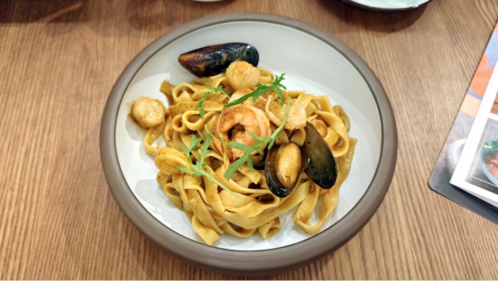 Семь меню и карт. Семь! На одного гостя. Я давно такого не видел. Типа все поняли, что разобраться (да просто прочитать всё) просто нельзя. И ведь глупо же этой массой задавить самое хорошее — меню очень вкусное: процент блюд, что хочется попробовать, прямо удивительный представлен. Цены удивили, поразили. Шесть стейков нормальными «весами», по 220 г, все по 890! Даже оленина! Салат с гребешком — 570, стейк из лосося — 900, а не 1800, филе-миньон на углях, с картошкой и луковым кремом, что суммарно 360 г, за 900, а не 1800. Сырный рамен с говядиной — 490, а не 890, или вот фетучини с гребешками, креветками, кальмаром и мидиями — 630, а не 1000. В общем, если это ещё и неплохо приготовлено, у десяти заведений этого ТЦ появился самый демократичный конкурент, ещё и сильный с его нельзя… густограм-подачами и эффектами. Большой красивый лимонад — 330: и так дёшево, а графин вообще 600. Чай, большой объёмом и хороший выбором, есть даже Да Хун Пао, весь по 290, вода 190, кофе 170, смузи 300. Удивительно.