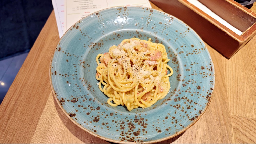 Интерьер если и меняли, то только ремонтировали. Узнаваем, добр, понятен. Всё в полном порядке. Ничего не шатается, не обшарпано, или вот свет: большинству новых мест учиться, учиться и ещё раз учиться, как завещал Великий. Мне приятно тут находиться. Возможно, потому что на местный диван насильно не усадили. А он есть, он справедливо красный, как цвет предельной опасности! В 19.00 воскресенья — почти полный зал, три блюда в «стопе» и почти все десерты, кроме одного. И сообщают сразу, подавая меню: старая гвардия не портит борозд! Андреа в зале, работает с гостями, прощается «до завтра», вызывая бурю улыбок. Артистичен и органичен, и не только в танцах на барной стройке в Ripasso: я в своё время боялся смотреть рилсы заведения. Он-то шутит про завтра, говоря с обычными гостями, а я сломаю шутку и действительно приду не через две недели, как они, а завтра!