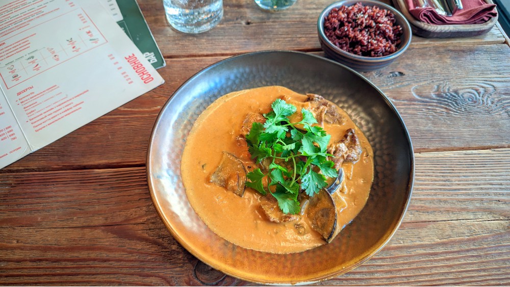 Читать меню на одном развороте тетради удобно. Удивился демократичному тону. Всё познаётся в сравнении: у «одноклассников» давно кофе отдают за 280 — тут 170, а чай 350, а не 600-700. Вода Edis, пол-литра, 250, а не более 450, как в 98.46% мест. Десерты от 220, а не от 440 — баскский, например, 390, а не 590, даже «тематический» пад тай стоит дешевле корнеров всех брендов и площадок: 550. Много блюд можно взять половинками — спасибо от одиночек. Много значков на немногих страницах, а несколько блюд одновременно и «Это топчик» (можно не читать, что заведение Перцева — его словечки), и NEW. Есть завтраки, что «весь день», но до 18. Приходят люди в 19.30 и, сам видел, спрашивают, что из завтраков можно приготовить. Постоянники, блин…