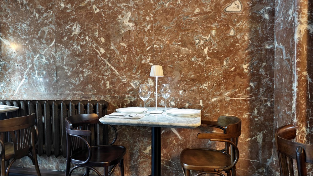 Вывески, вернее, окна, тарелки, меню — всё «Документалист». Особенности исторического здания — старый холл, бывшие конюшни, всё это нельзя современно осветить, но на всех столах отличные лампы. У многих есть аккумуляторные, но тут ещё правильно подобранные. Это хорошо. Гораздо лаконичнее и правдивее прошлого антураж, теперь исторический, без нагромождения фото в рамках! И мебель классическая, со стульями — любо-любо! Есть и минус — дико холодно: столы тут в нескольких метрах от входной двери, что постоянно открыта: или разгрузка/погрузка длится по полчаса, или доводчики не помогают, сломаны, и все восемь уличных градусов на руках, хоть перчатки надевай в холодном мраморе стен и холодном мраморе столов. Кажется, пар изо рта, ведь ешь как на улице: дверь не закрыли до подачи первой перемены! Простуда в подарок за ваши деньги, а что будет зимой, даже страшно (холодно) представить. Будут тепловые пушки ставить или запрещено? Наверх по лестнице — общий туалет студии, это я помню, но пустой диспенсер не должен быть ни в ресторанном, ни в общественном.