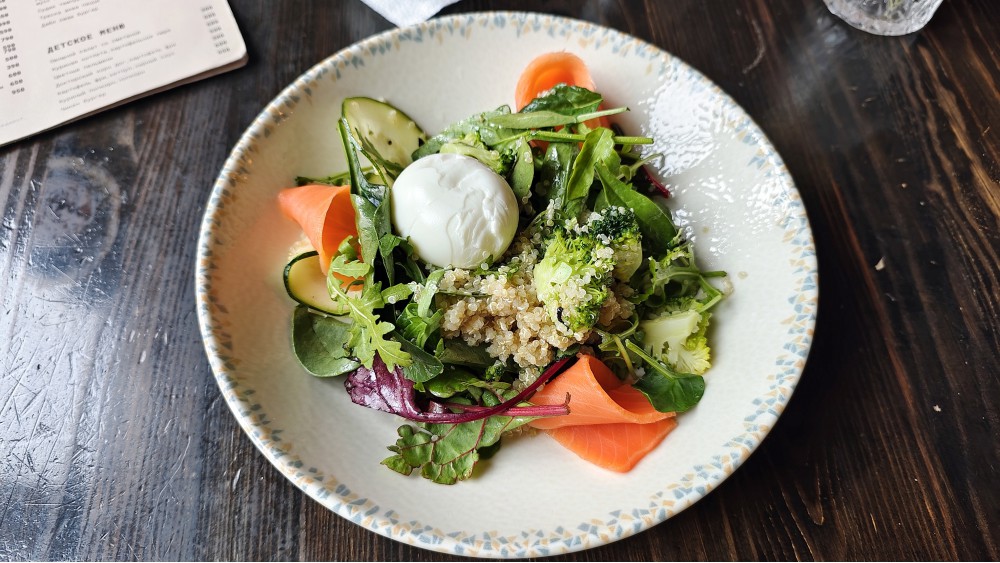На посту никого, но и заведение, как никогда бы не думал, далеко от аншлага: заполнено даже не на пятую буднюю часть. В чём дело? Но дождался девушку-хостес: встретила, дала меню — настоящее, на полукартоне, и… Забыли гостя в центре, на проходах, у бара, куда ходит весь персонал, которого много. Катастрофа, если гостю надо искать через десять минут хоть какого-то внимания. Повторю, аншлагом пустой ресторан в ланч, состояние дел не назвать. Полный пофигизм: персонал вообще не работает коллективом, ОПЯТЬ, даже чтобы попросить счёт или вернуть «крайнюю» тарелку, не смог привлечь внимание. Всех крутящихся рядом, даже кивая. Десять минут. Сидишь и смотришь. Тут кто-то оставляет чаевые вообще? Это всё про первый визит! Когда читаешь меню.