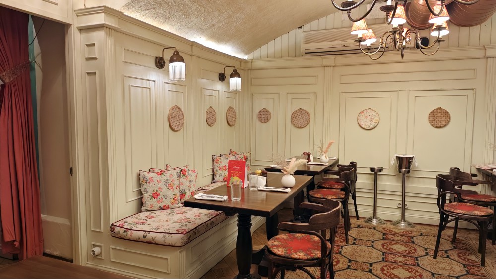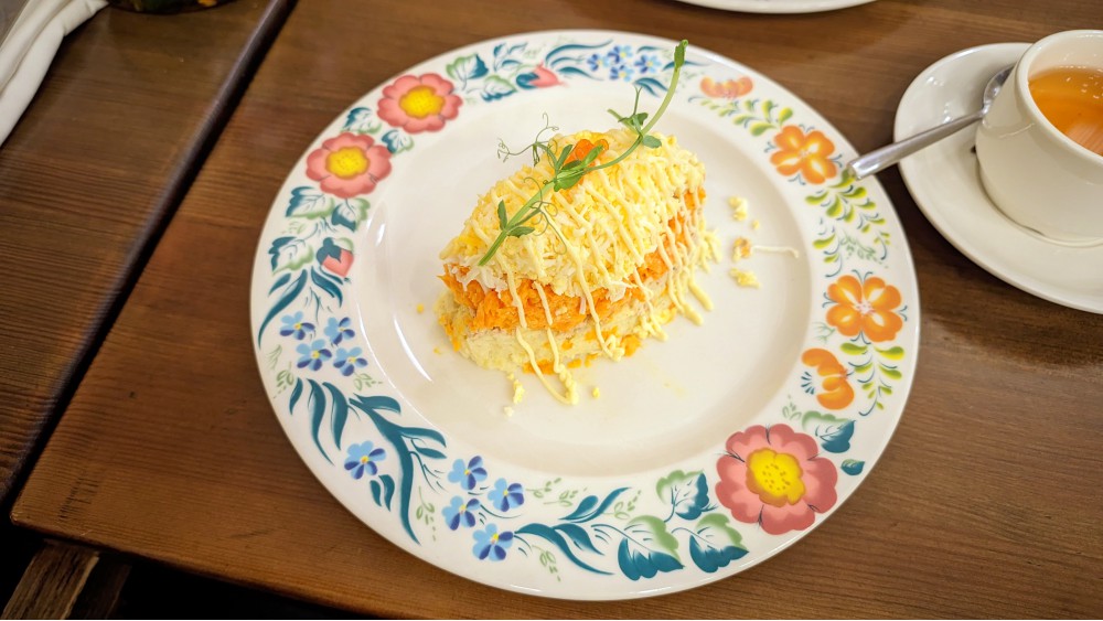 Десять лет назад открылось это заведение, которое сайт Ginza сейчас представляет так: «Напротив Казанского собора, на углу Невского и Малой Конюшенной, расположилась Katyusha, ресторан традиционно русский, родной, живой и очень гостеприимный». Десять лет назад, а как будто сегодня всё подходит, я представил девушку чуть иначе: «Новый ресторан русской кухни, хотелось все это написать заглавными буквами. Кухни, которой в городе должно быть в десять раз больше, я уверен, и это не патриотизм, а здравый смысл. Далее: на Невском, от Гинзы, летом, в сезон! Ругать буду страшно, но, сразу напишу, что на Карту (рекомендуемых) поставлю. Даже без «звезд» пока. Потому что, с русскими ресторанами у меня совсем плохо в Топе». Да, и тогда, и сейчас, КРИЧАЛ про то, что преступно мало у нас русских заведений! Да, все были авансы: тогда еще шел ремонт в основном помещении цоколя без окон, только в туалет, он сразу от входа, пускали – ресторана то, и не видел! Впечатления/выводы были неоднозначные. После этого, только в 2018 году, сравнивал… вернее, пытался сравнить местную киевскую котлету с десятью другими в рамках одной тогдашней рубрики… Пришел сравнить, даже сел, но официанта, принять заказ так и не дождался - ушел. Это даже предупредив хостес, что можно прислать к столу сразу – я был готов! Теперь вернемся в 2025-й.Без веранды на Невском - запрещены нынче, работают три зала, что от времени выглядят лучше! Та потёртость, что не хочется ругать. В которой теплее. Предметы старые, местами с неким перебором плотности экспозиции, что через десять лет стали еще более ретро. У меня только одно заявление: адская реклама врывается в атмосферы посреди саундтрека. Понятно, что своё рекламируют, мероприятия разные, не подгузники, но Майя Кристалинская и Эдита Пьеха явно неодобрительно голосят потом!
