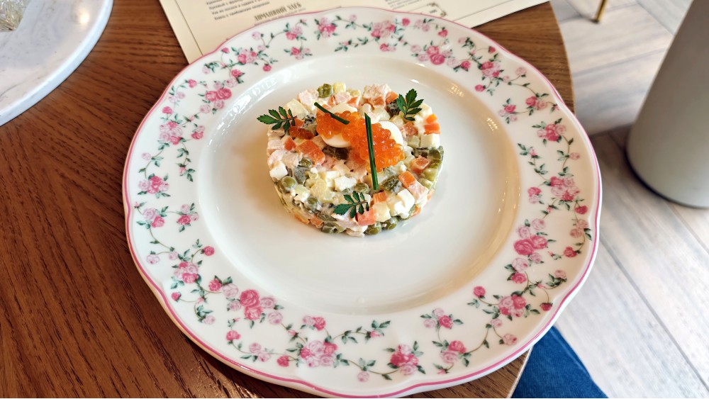 «Нисуаз» с консервой за 1000 — спасибо, Аня, но нет. «Оливье с пастрами» в фестивальном-сысоев-меню, честнее назван в базовом — «Оливье с пастрами из индейки» (770). Точно бы не повторил: немного, скучновато, суховато, холодно, от этого дежурно, как вытащили из холодильника и НА. Да, нарезка дисциплинированно прекрасна, в столовой не положат такую копчёную птицу — она и правда настоящая звезда, там не украсят красной икрой, а в остальном, боюсь, там будет ярче и интереснее есть. Пока «нет», ни за 330, ни за 770.