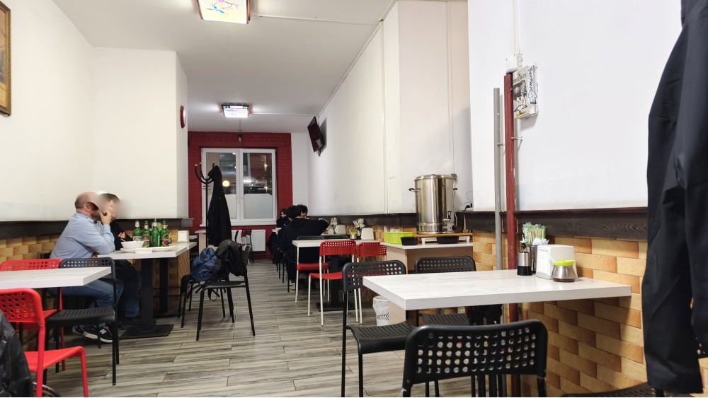 И неожиданно попадаю в крошечную китайскую лавку с полками «дошираков» по стенам. Общепит ли это? Не сразу понятно, куда вообще идти. Думал, в новых домах такого и не строят уже. «Вам налево», — подаёт спасительный голос китаец за кассой в углу, указывая куда-то «туда», за холодильник с напитками. А там узкий, как коридор МФЦ, зал из двух условных частей, с таким же светом, оформлением, дизайном, мебелью и одним окном в конце. Меню надо брать сразу у кассы: потёртый буклет на кольцах, где всё максимально русифицировано названиями — издержки локации. И заказ там же. Удивительно, но тут уже принимают карты! Беспрекословно и без кривизны лиц, и даже дают чек — и это единственное, что потом позволит вам получить еду, которую с кухни принесёт почти не говорящая по-русски уборщица-официантка. Номеров нет — формальность убила бы таинство! В общем, мне пока всё нравится…