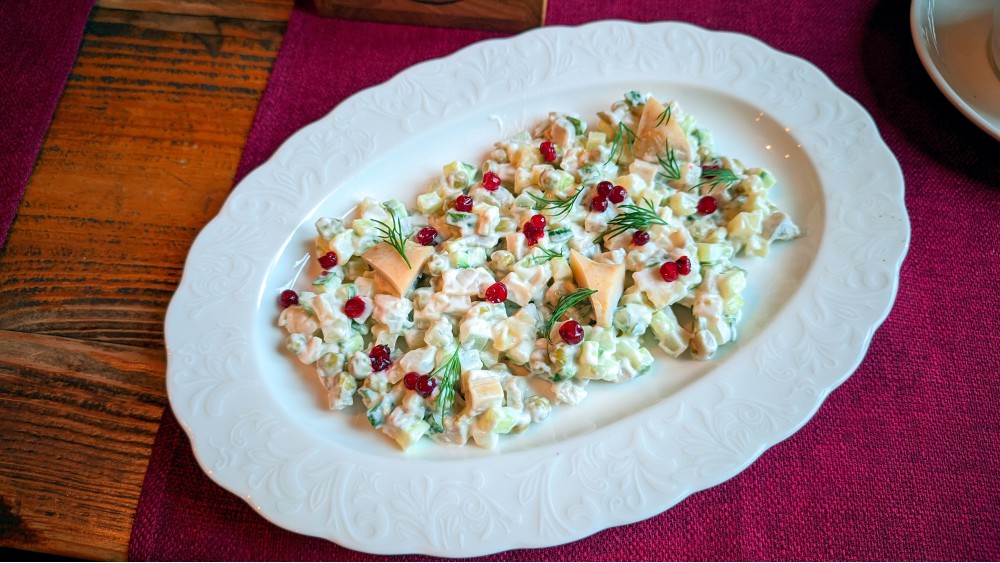 Давно тут не был, с ноября 2020-го (https://allcafe.ru/reviews/kolonka-restorannogo-kritika/restorannyy-kritik-gulyaet-prazdnik-dushi-v-traktire-hlebnikov/). И не вспомнил бы, наверное, если бы не прислали два крайне интересных предложения: вот как надо заинтересовать, сразу двойным ударом! Во-первых, дополнительное, что нет на сайте (грандиозная недоработка!), меню с несколькими версиями салата Оливье. И буклет «Путешествие в Историю»: там восемь блюд по всем курсам, и это набор из всего интересного, не обыденного. Спросил, конечно, по срокам предложения: эти части меню обещали сохранить до конца года, а значит, есть смысл пробовать, сообщив все мысли, что, надеюсь, не пропадут даром.