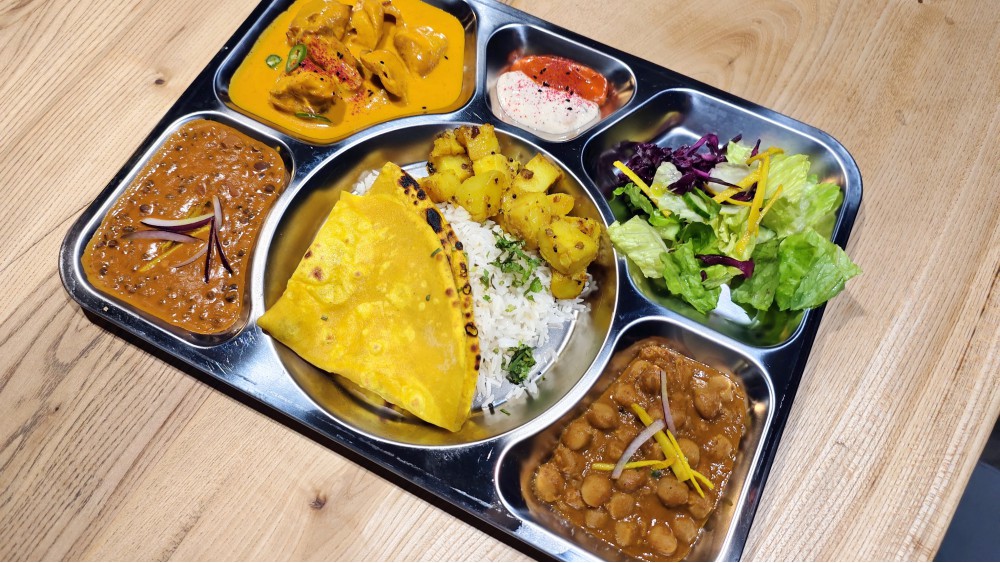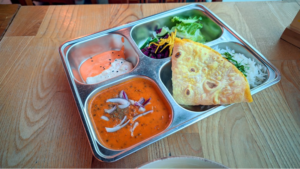 Раздел «Карри» — Дал Махарани (590). Чечевица в пряном овощном соусе карри и рядом всё, что идёт и в другие блюда раздела: рис басмати, красная капуста, пикули кубиком в райте и самодельная, я два раза спрашивал у двух разных людей в чалмах, лепешка. И вот её, лепёшку, за прошедшие пару дней сильно так доработали. Прошлый вкусный блин цвета бледного раскрасили яркостью нута или чего-то похожего, ну и новая, легче прежней, фактура. Прям влюбляешься! Да.