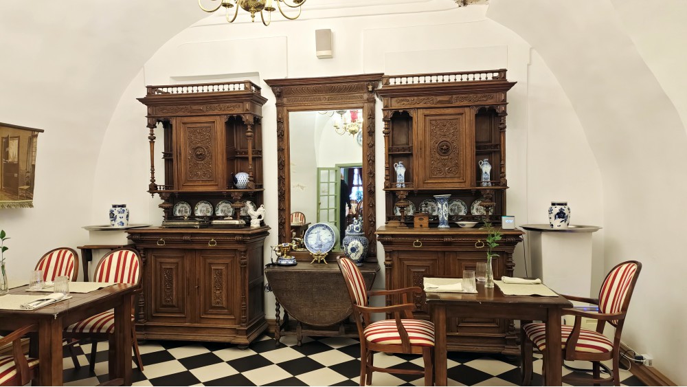 Светлой штукатурки интерьер как будто подновили, подремонтировали, освежили, не более того. Оставив его почти прежним, судя по фото. Я помню эти стулья, эти полоски, и как на них удобно. Свет совсем не современный, что ожидаемо в условиях исторического помещения, но есть местечко, что в полуметре от окна — благодарите за фото исключительно его! Встреча и полноценный гардероб, с совершенно музейной дамой, настраивает на хорошее сразу! Сервис очень понравился. Молод человек, да, но спокойный, как и музей, интеллигентный-культурный, как музей, чёткий, когда совсем не придумать претензию. Отлично!