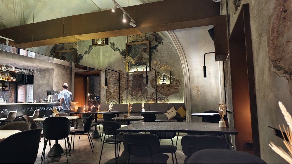 Шок. Я же проверял, даже думал бронировать. В первый визит, будним днём, мест почти нет: ждал за неудобным столом, пока не смог пересесть поуютнее, а в 19.48 я вообще один! В окнах никого, ни гостей, ни персонала, думал, вообще закрыты, а они работают. И официанты на месте. Странно. Я всё понимаю про завтраки как профиль заведения, но тут вторая часть меню совершенно взрослая, интересная, и ужину созвучна сполна! И бар, и коктейли есть… И вполне универсальный интерьер.