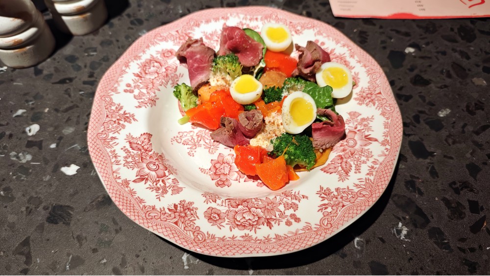 Сначала всё как мы любим: ресторанная встреча, гардероб с номерками, и вот ни одного некультурного субъекта в пухе. Три туалетных кабинета, а не один, это на десяток столов — без очереди. Потом всё, что не люблю, таким величественным, как канал Грибоедова, потоком. Стол шатается: «Если сможете починить, мне бы лимонад, а то разольётся». Офисы с ноутами, с картонными стаканчиками, это при почти аншлаге и ожидании столов, тут удивляют — не кофейня всё же! Стоп-лист, который не говорят сразу, и вот, даже попадая в одну позицию, приходится передумывать заказ. Ну зачем сразу не говорят? Крохотный стаканчик лимонада (380), наверное, впервые: если там есть 0.2, то не написано в меню. Зато вкус прекрасный: полнотелый, взрослый, не разбавленный промышленный сироп сахарный — верю, что самодельные заготовки! Не люблю мелкое, но и второй раз купил «Персик/Алое», где второго вкуса больше. Кофе 210, чай 450, вода от 380, как и фрешики.
