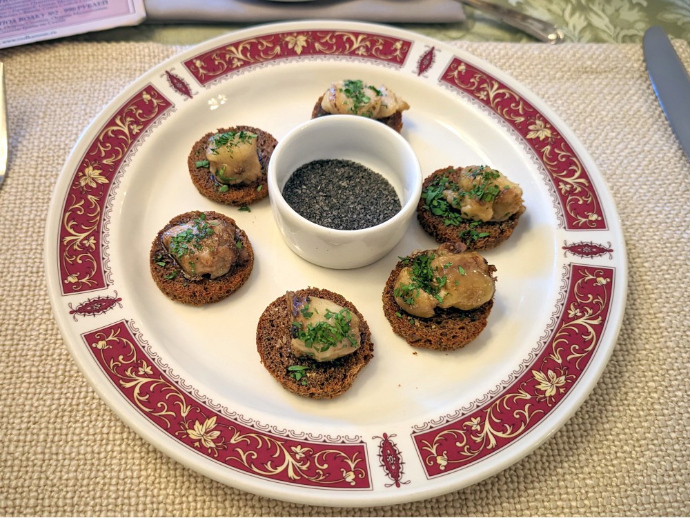 Днем по будням, с 12:00 до 16:00, вместо основного дают обеденное меню: головоломка с большим числом строк и мелким шрифтом. Как и десять лет назад, персонал не может четко объяснить, чем одни строчки отличаются от почти таких же дублей в основном меню. Это не вина официантов — сама концепция запутанная. Я ругаю это с открытия, и два молодых человека независимо подтвердили: проще было бы сделать прямую дневную скидку 20% и не мучить ни кухню, ни гостей версиями одного и того же блюда. По словам персонала, где-то «меньше гущи», где-то — «скромнее порция», а кое-где произведена замена ключевого ингредиента, как в бефстроганове. Понимаю, это не эконом-ланч, набор из двух блюд все равно в тысячу не уложится, так зачем такие сложности? Откладываю дневное меню и прошу обычное.