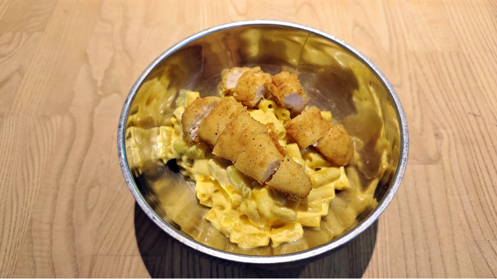 Кобб-салат с креветками (590). На фото три хвостатых в панировке, можно сравнивать с отданным. Всё неплохо, и орехового соуса хватает на всё. Одно но: помидоры позорные даже по мерке самых беспонтовых, что мне подавали года за два. Портят всё впечатление.