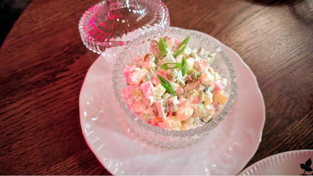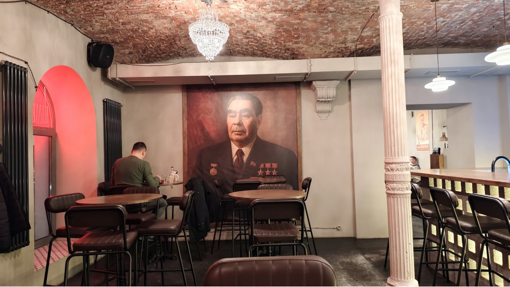 Когда меня, пионера, что присягал на книгах Брежнева, сажают прибухивать в нескольких метрах перед его портретом размером в полстены, даже добрая алкашка в горло не лезет. А не разместиться иначе: думал, в тихую среду не надо бронировать, а зря. К 20.00 полный аншлаг, пришлось коротать время за столом, где никогда бы не стал сидеть в ином случае. Высокий, на высоком стуле, без света непосредственно на потолках. Когда помогает только рассеянный от стойки и от красной вывески, люстры манкируют своими обязанностями, как декоративные. Еда выглядит перед носом, вживую, хуже, чем на фото: телефон вытягивает, и вот вам что-то видно. Основной зал хорош, основной комфортнее для еды, но строили как для компаний как самого выгодного потребителя в бизнесовом плане: много больших столов и комфорт.