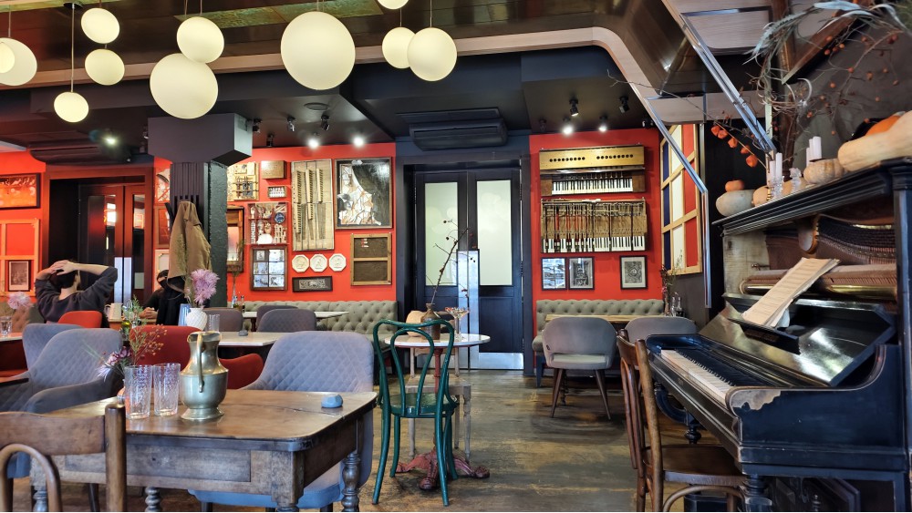 По первым ощущениям... Хочется сказать себе: зачем пришёл, просыпайся, приходи в себя, уходи. Всё, что не люблю. Девушка не может решить, она принимает куртку или я её вешаю сам: не отнимать же вешалку, вдруг обидится? «Могу предложить только этот стол…» Да, много гостей на завтрак, но столов вижу пять — никто не спрашивает, никто не смотрит, на какое время забронированы свободные, если это не мистификация, конечно. Если через час, я бы не мучился за фиговым по центру. Нет, лень глянуть, изучить брони, перевести взглядом по цифрам — это же работа. Брони в виде бутылей простояли, разумеется, весь час — других, наверное, разворачивали. Потом уже семь столов пустовали, а гости уходили... 22 года ровно одно, не меняется ничего. И гостям плохо, и владельцам. Что ещё? За моим столом прилагающийся стул раз... рас... фигачен старостью так, что, пошатав его на пять сантиметров, побоялся садиться и сам поменял. Свет — в полдень — очень плохой: много, целых два десятка круглых светильников под потолком дают феерию каши теней и ни одного чистого тона на еде. Наверное, это «уют», но для посиделок, а не для еды в фокусе. Да, всё молча, без повторов заказа, да, все тарелки уносили без вопроса, только перед оплатой смог столько рассказать важного. Всё не то...