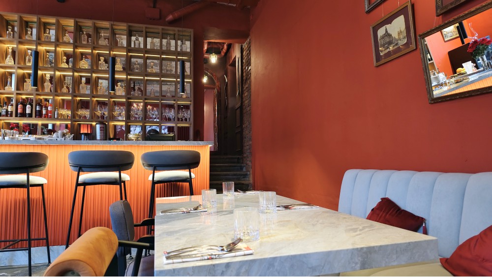 Пара окон по фасаду, один небольшой зал, что старались оформить уютом. И это удалось, если не смотреть на площадь у входа, не сильно симпатичную. Тёплые тона, стены, увешанные плотно рамками, проектор с черно-белым Some Like It Hot, выразительный бар или манекен-светильник… В отзывах пишут, что и шеф выходит к гостям, а для меня это — для антуража, для суммы впечатлений в зале — важнее посуды или марки мебели, но не случилось увидеть Главного. Главным было…