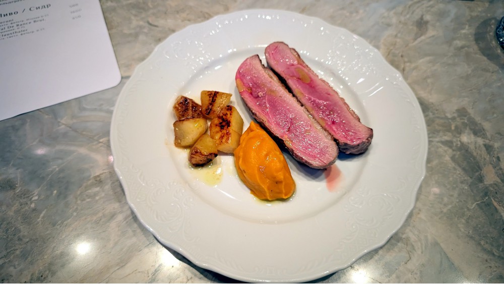 Цены от убийственных до средних, как кошка по клавиатуре бегала. Перец рамиро, ещё и кроха-закуска, что везде в районе 600, тут 1200, гарнир — просто картошка фри — не 300, а 600! Зелёный-просто-салат за 1050: не с рестораном Aga же сравнивать гастробар на Гаванской? А придётся. Всё равно открытий сейчас мало, треть от ноября 2024-го, вот и пошёл, скрипя кошельком.