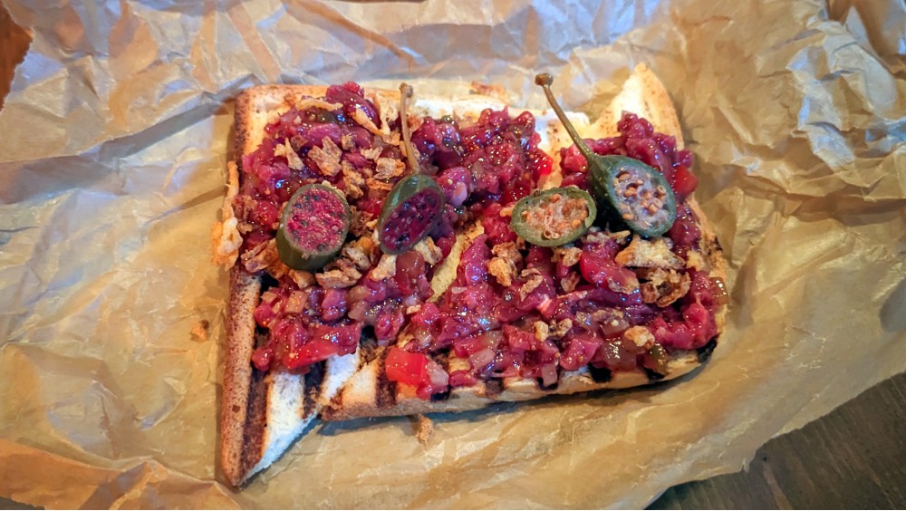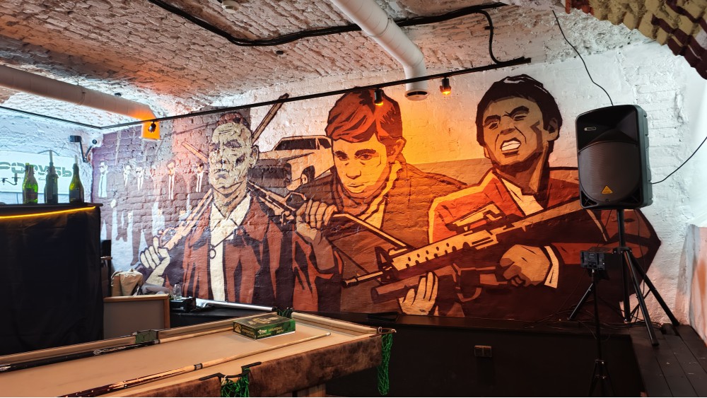 «КоЛоМаН» — прошлое и не сильное благозвучное название до ремонта, от слова «Коломна»: угол Декабристов и Английского, рядом г-н А. Блок, а нам в цоколь. Посадка основная — высокая и барная, где полка мягкая не соотносится с высоким столом, и будущая моя тарелка оказывается на уровне кадыка. Так что только если слева три стола с обеденной посадкой, даром что мой покерный... с кубиками. Киноантураж — и рамками, и граффити от Данилы Багрова до Джейсона Стэйтема, и вот проектор не мешает обстановке: он родной! Всего две вещи смутили. На столах бутылки с водой, что принял поначалу за брони, но нет стаканов. Гостеприимства элемент: хорошо придуман для демократичного бара, но которым не воспользоваться? Ну и пустой диспенсер в только что убранном туалете, ждал немного даже.