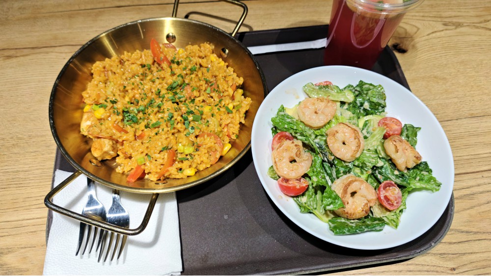 Паэлья с курицей и чоризо (490) аппетитнейшая, хочется разглядывать, курица, колбаска нормальная — выше нормальной можно ли сейчас найти? И нет изъяна прошлой паэльи — всё круто по специям. Сразу радость от риса.