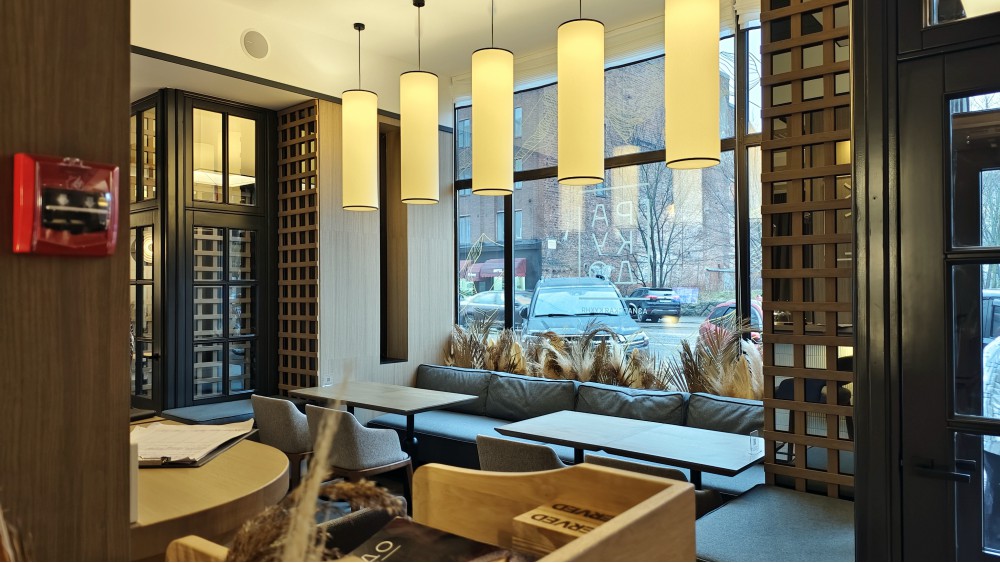 «Два зала: основной с открытой планировкой и приватный, предназначенный для камерного отдыха, что позволяет собирать публику под различные цели визитов – от повседневных встреч до уединённых мероприятий». Удивительно приятное место! Интерьер трендовый, узнаваемый годом выпуска, с аккуратным минимализмом японским, но всё со вкусом, хочется рассматривать. Не эконом, не стандарт, не скучно, без яркости, без аляповатости. Есть диваны, что выглядят опасно, но большинство мест — комфортнейшие стулья в зале, что разделён буквой П островом бара. По дороге в туалет заметил отдельный зал, по ступеням ниже, в лаунж-стиле. Но никто не прокомментировал, только сам анонс вспомнил. Столько раз говорил, как важна встреча и знакомство, что в новом месте, где все первый раз, что в туристическом, где большинство гарантированно впервые.