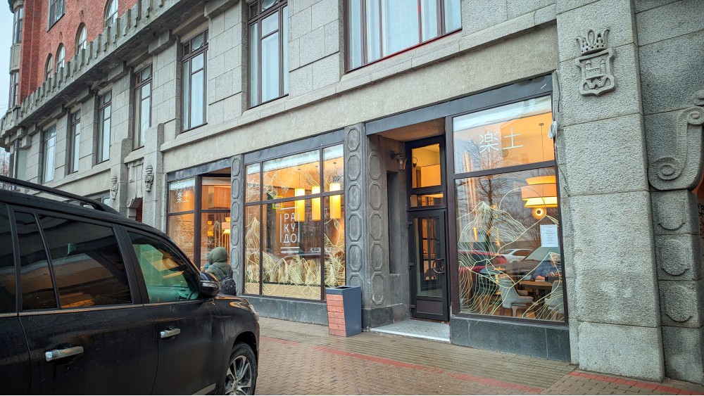 Я-то нашёл заранее, созрел, готовясь, но если вы просто приехали в Выборг, ничего не знали, то с вокзала много раз наружная реклама попадётся за столь короткий отрезок. Без шанса не узнать про новинку: «Rakudo паназиатское кафе. Вся Азия в ваших руках! В переводе с японского “ракудо” значит “райское место”. Именно такое место владельцы ресторана и постарались создать: знакомые сочетания ингредиентов, достойные порции и демократичные цены — про традиции, гостеприимство и щедрость… Кажется, это новая визитная карточка Выборга!»