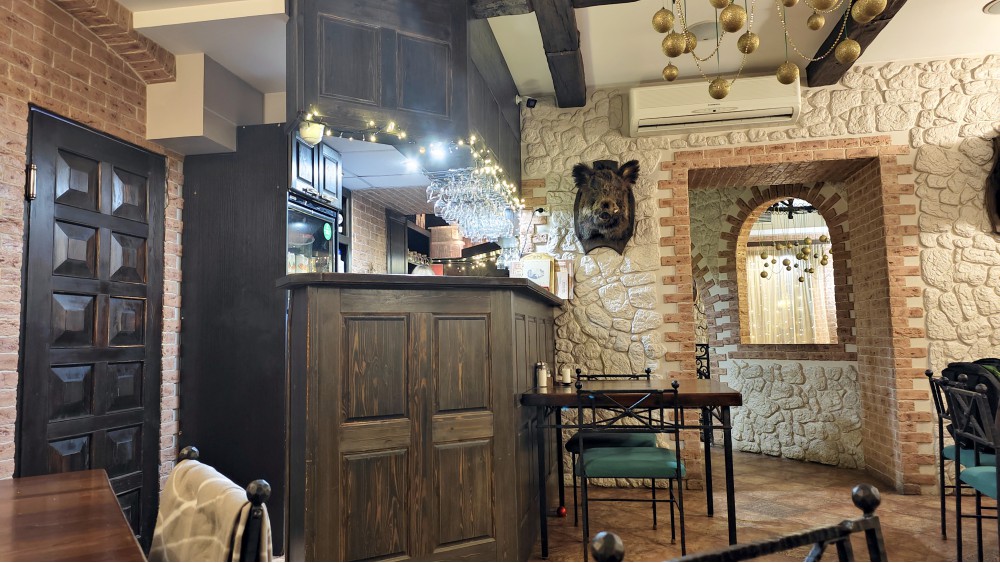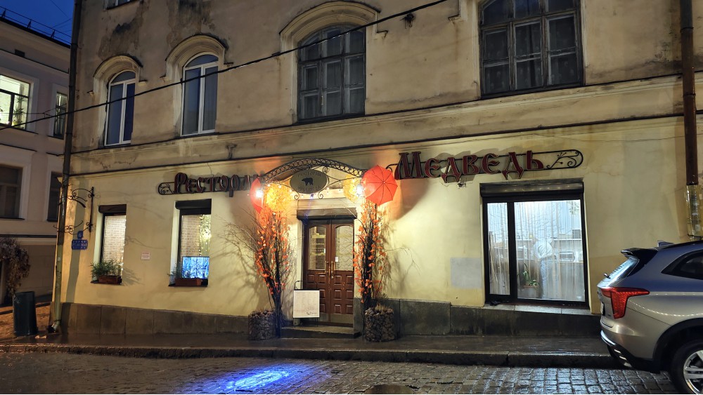 А так, обычный «средневековый» интерьер, наверное, в Выборге таких сотню построили за прошлые годы, на два зала по три стола. С чучелом медведя и головами кабана. Света почти нет, свеча только мешает, перебивая три бра электрического накала, и то на противоположных стенах. Стулья, спасибо, столы — всё нормальное для обеда. Стойка — как 90-е дыхнули, туалет, закрытый от туристов на магнитную карточку, её надо просить на барной стойке. Нормально, если вкусно, то всё нормально!
