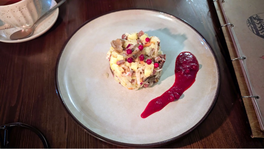 Меню как с перепутанными страницами — разделы идут вразнобой. И заказать, если не готовился, как Борис, не так просто. Самое интересное, конечно, «Охотничье меню» — собственно, причина визита, но и в других разделах есть что обсудить. Настойки есть готовые, есть свои, они без цены в меню, и только то, что есть сегодня, на слух. Мне показалось, заводские (250) поинтереснее домашних («250/40 мл» написано, правда, с очепяткой — 125 мл), домашние простые, односложные. Большой чайник чая — 250.