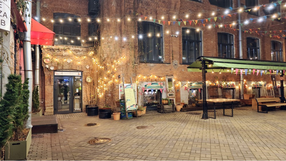 Несколько ступеней вниз и один небольшой, уютный зальчик, которому старость всего внутри (и стен снаружи) идёт. Большая барная стойка, один диван, только стулья у немногих столов и вполне обеденное настроение. Да, веранда работала полгода, увеличивая посадку в три раза, но и без неё всё органично прекрасному двору Кластера. Из неудобств даже не свет — привык, а стол. Шатается: какие тут напитки, просто облокотиться, руки положить неприятно. В остальном всё неплохо.