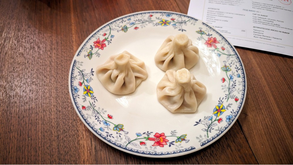 Меню… Какое смотреть? На входе выставлено одно, в руки дают другое. Оба новых? Оба новых. Отличаются позиции, отличаются цены: суп из томатов, он 320 или 350? Меню (рассматриваю уже бумажное) вызывает... самую тяжкую массу чувств. Про него можно писать три страницы, но я сожму. Смесь лексики типа «Закусь» и «Мяско» и классические выражения, есть «Театральные бутерброды» (видимо, оригинальный раздел «Буфет», в такт новому названию), в нём всё по 369, даже чипсы или квашеная капуста. Салаты — из десятки всего два условно грузинских, как и один суп из четырёх, хинкали, у которых указано «небольшие», по 50 граммов, что есть половинки от обычных. Это ладно, но это тут «большие», и на их фоне есть и целый раздел мини-хинкали. Вопрос: они сколько Дюймовочек? Цены разные, есть и понятные, но вижу и нелогичные, странные: столичный салат с птицей не 350, а 550, так же, как и бефстроганов, что везде стоит в два раза дороже майонезников! Но вдруг всё хорошее? И непонятное обернётся вкусным!