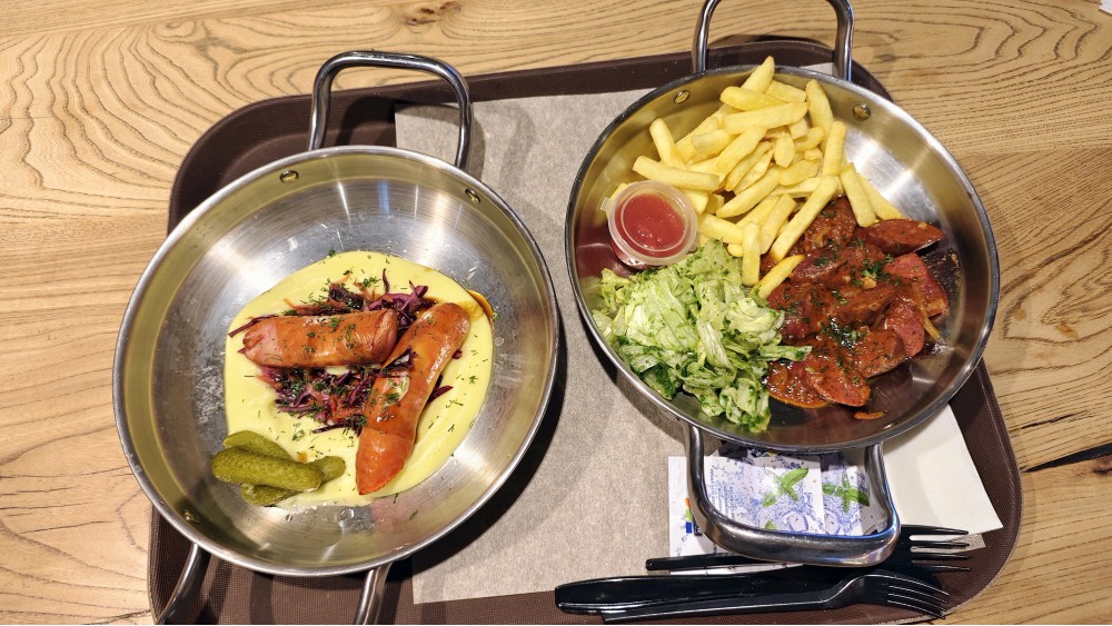 «Берлинская тарелка» (740). Два вида колбасок: говяжья прям прекрасная, а вот свиная... Или слишком жирная, или слишком сочная, или слишком яркая, или слишком сыроватая… На вкус. Цвет-то белоснежный, сок прозрачный… Сомневался, готова ли всего за минуту… И слопал. В любом случае, я прожжённый терминатор (еды), но «для всех», наверное, надо на минутку дольше держать на гриле. Что ОЧЕНЬ радует, я уже говорил, — отношение: все блюда и наборы постарались сделать разными. Дополнения — уже шестое блюдо ем, а впервые встречаю тут меленькие маринованные помидорки и капусту лёгкого оттенка, с пятой частью лука в замесе. И прям отменная фри! Вкусно!