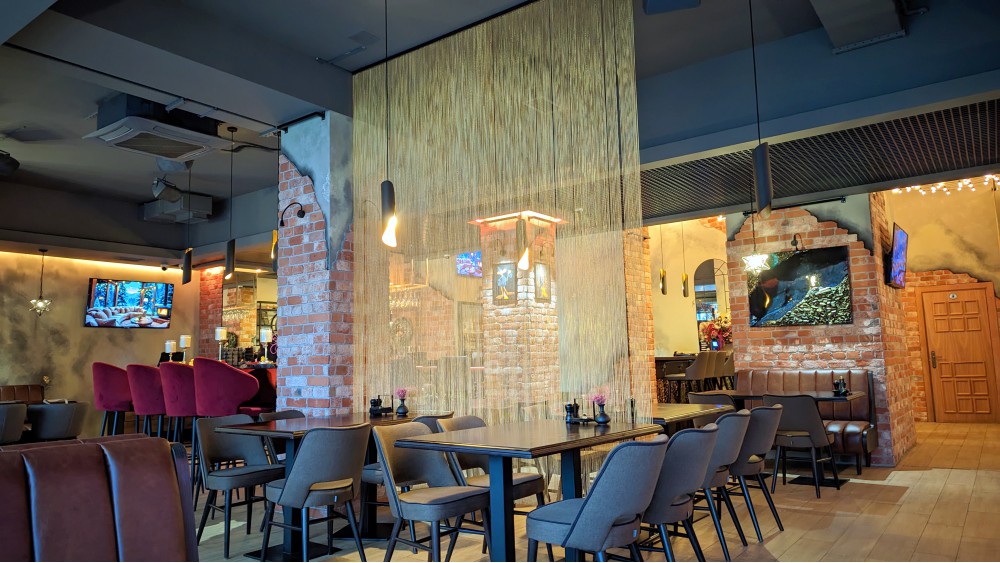 Не только меню, но и интерьер обновлён, со старыми фото не сравнить. Я готов принять любое дизайнерское решение, и, в принципе, тут четыре или пять вариантов посадки, старомодной, конечно, но есть и удобные. И решёток железных больше нет — они всё очень упрощали. Беда, теперь редкая: лампочки мигающие. Не на экране телефона, а просто глазу заметно мерцание, не скрыться от него, и не только мне, но и честному персоналу. Не одна такая, несколько таких по ходу зала — не все, а впечатление дарят на всё пространство. Над моим столом просто умирал прибор, затухая периодически совсем. Мешая и фото, и видео, и состоянию мозговой деятельности.