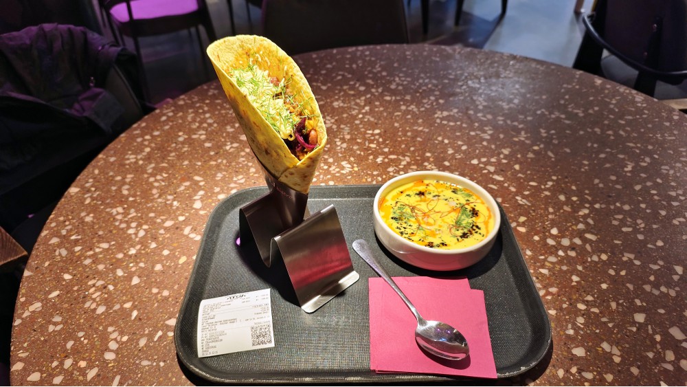 С фасада — заметно, правильно, стильно, особенно на фоне скучного соседа. Меню изучал заранее, так что не знаю, схватывают ли оригинальную идею гости при контакте проходящего мимо в 2-3 секунды. Тут важен персонал — персонал хороший. По общению нет вопросов: от человеческой вежливости, что стала дефицитом, до рассказа про концепт — сначала аккуратно, заинтересовать, не бомбить текстами, не перегружать. Просил всё по одному делать, оплатив сразу — так и делали: один корнер из десятка на моей памяти. Дело не в удобстве — другая еда: живая, свежая, не остывшая и не засохшая. Молодой человек на второй визит, уже ужин, другой: хорошо я выбрал время, посмотрел разные смены. Рассказывает так же ладно — вам повезло с персоналом. Нет вопросиков! А у меня РЕДКО не бывает вопросиков: такая работа.
