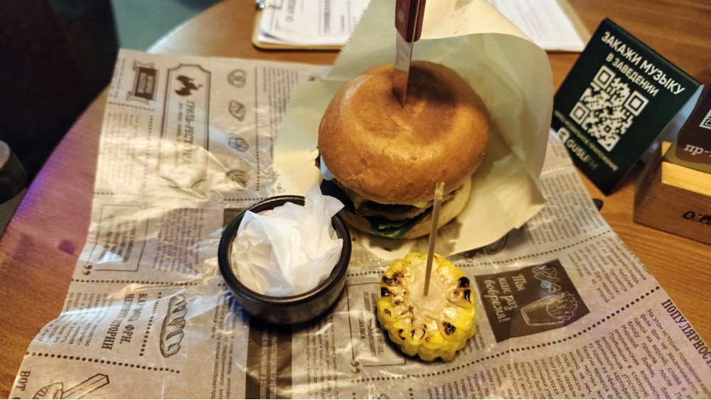 Помещение с тыльной стороны «хозяйственного отдела», кто помнит, Московского универмага времён СССР, что побывало много кем: от вафель как концепта в 2000-х до узбекского ресторана. И последнее время, с демонтажа веранды, никого не возбуждало: пустовало. Нашлись арендаторы — уже хорошо! И опытные, не на пару месяцев, надеюсь, заехавшие. Этих «Хулиганов» хвалил летом в новом баре на Радищева (https://allcafe.ru/reviews/kolonka-restorannogo-kritika/restorannyy-kritik-huliganit-v-o-hooligans/): отличный уровень, добро сложено, надеюсь, пожинают полгода успеха в центре, всё у них хорошо на той сложной площадке. Но там, как понимаю, организовано некое ответвление от концепта, выше гастрономически. Тут всё и на вид проще, ниже вложениями, чем все остальные точки сети, где был... И да, флаг «Мы открылись» перед входом, кажется, приехал с Радищева: «гастропаб» написано.