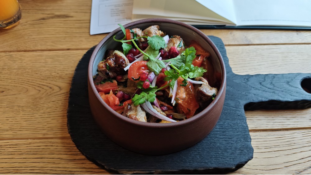 Застал на праздники похмельное меню из блюд разных традиций, где настойка за 380 полагалась в подарок к каждому, и столько было занятного: рассольник с копчёным свиным ребром или мужужи из говядины (!!!). Но мне интересно регулярное меню. Восторг. Цены немаленькие, но сейчас даже не во второй двадцатке! Почти всё дешевле или вровень с «демократичной» грузинской сеткой «Хачо и пури» или новым «Асканели бистро» (просто совсем недавно был, могу сравнивать). Меню интересно издано: могу хвалить за внятность, за красоту дизайна. Могу ругать: как будто хотели сделать больше страниц, как у сеток — десяток, просто разместив на левые стороны разворота фото блюд, как в советских книгах, где, помните, делали вклейку офсетной цветной печати. Вода от 370, лимонады домашние 400/400 мл, чай 500. Морсы, три в карте, по 260. Пробовал все, хороши до края. Я бы указал только, что смородина у них чёрная.