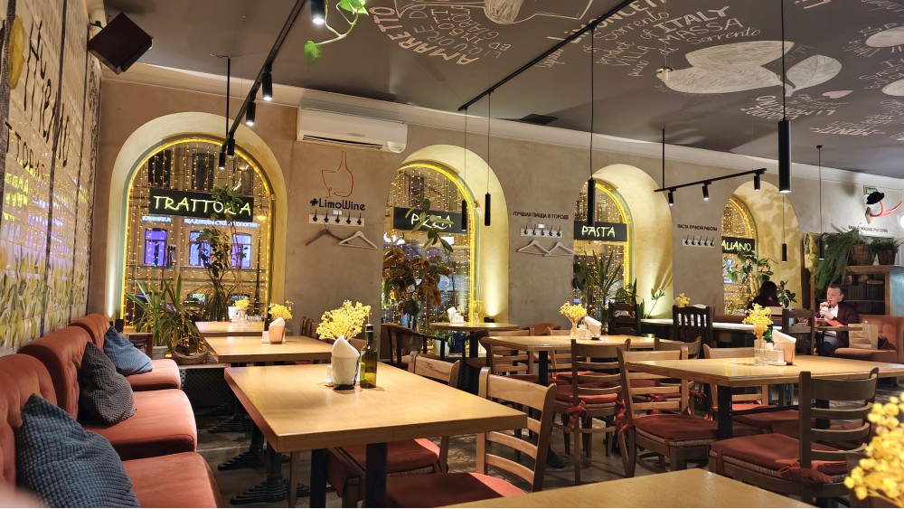 В старых итальянских ресторанах, даже в Петербурге, даже по меркам нашего рынка (2010), есть особое итальянское очарование старых, по меркам той страны, ресторанов. Когда не могу ругать за старомодность. Сидеть удобнее, чем в 9 новинках из 10, свет просто шикарный, подушки исправляют ширину диванов — мне многого не надо. Давно не был, не скажу, что поменялось… Или не поменялось. На стене висит (или не висит) красивая табличка: «Тут ел Алексей Буров, когда строил “Фарш и Бочку” (2014), и ему нравилось!» Табличка чуть меньшего размера, чем у Vox, про работу в нём юного Дмитрия Блинова.