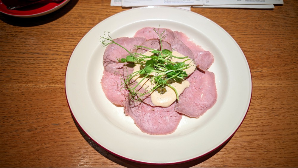 Вителло тоннато (750): гороха пучок, отварная говядина, не ростбиф, чайная ложка вполне приятного соуса, хорошие каперсы. Странно. Выглядит так, что хочется отменить заказ и/или убежать, а отложив горох и кое-как (экономно) распределив соус, всё с радостью съел. На вид как будто анабиоза сон длился с 2010-го по сегодняшнее утро.