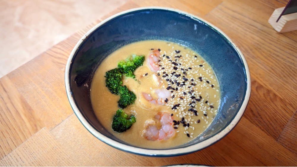 Сразу и наперёд: все цены не менялись, за что мой респект. Крем-суп из лосося с креветками (450) по-прежнему единственная звезда программы, без конкурентов — больше блюд, кроме разных поке, просто нет: даже если не хочешь суп, больше выбора нет. Был таков: «...счастье и повод для визита! Бархатный, приятно шершавый, ещё и рядком креветок снабжён». Сейчас лосось тоже на первом месте, креветок не меньше, брокколи хрустит и развлекает, но сам суп стал сильно крупяной натурой, как манка, мелко смолотая, в дело пошла. Ешь ложку, вкусно, а шершавость не та, сразу смотришь-рассматриваешь крупинки, и так по кругу. Было лучше, было круче!