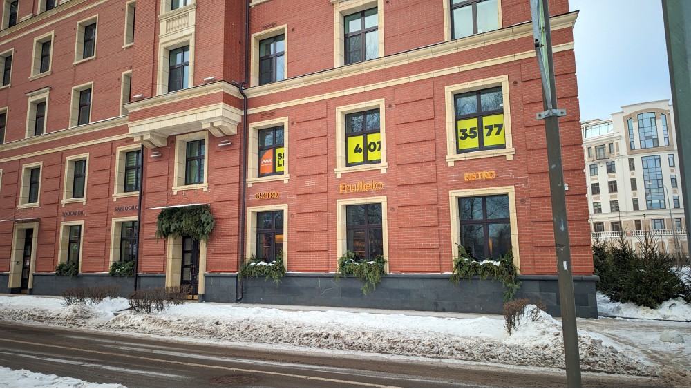 Всё прекрасно, дорого, умело, богато, созвучно фасаду и самому углу нового дома, видна работа с проектом, хорошо смотрится с любого ракурса, я же проверял. И в центре всего — кухня, место, что мне нравится своим акцентом на еду. Стол почти не шатается, сидения удобные, даже полочки у кухни не кажутся предназначенными для разных птиц. Всё прекрасно, дорого-богато, но пришёл самый злой человек на свете — светорежиссёр, и всё (мне) испортил. Есть точки над столами, но он присобачил в углу свет. Я прощу, не эгоист, прощу свет над другими столами, что даёт тени на мой, портит фото, мешает жить и без съёмки, но когда вредительство и смерть — намеренно, в пустую часть, это как? Удивительно, как его не обезвредили, и пока «Золотая Малина» худшему светорежиссёру Петербурга!