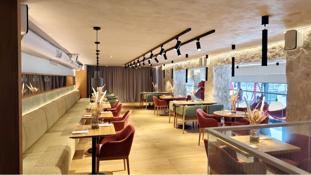 Ремонт полноценный: всё нравится, всё современное, стильное — что важно, точно другое! Всё под эти стены, что на рендерах казались бы дурными, как модные в начале века — на светлом фоне органична спокойная палитра. Легче прошлой. Это я хвалю. Первый уровень не может не нравиться в Петербурге — свет работает даже в мрачную пасмурность за окнами, построение, раскладка, где не мешает движение гостей и персонала, и (любимое) полное разнообразие посадочных мест, даже полукруглые купешки вписались. Ругаю только дурацкие кресла, что не передвинуть: толстая, не хватаемая средней рукою спинка тяжеленного снаряда — наверное, на фото в каталоге смотрелось уютно, а в жизни… Второе раздражение: свет на втором этаже — преступление (статья 1234 УК): точки над каждым столом на штангах намертво перечёркнуты контрастными освещением за спинами гостей, прямым и от зеркал. Уникально криминально так не любить повара и его творения. Остальное нравится.