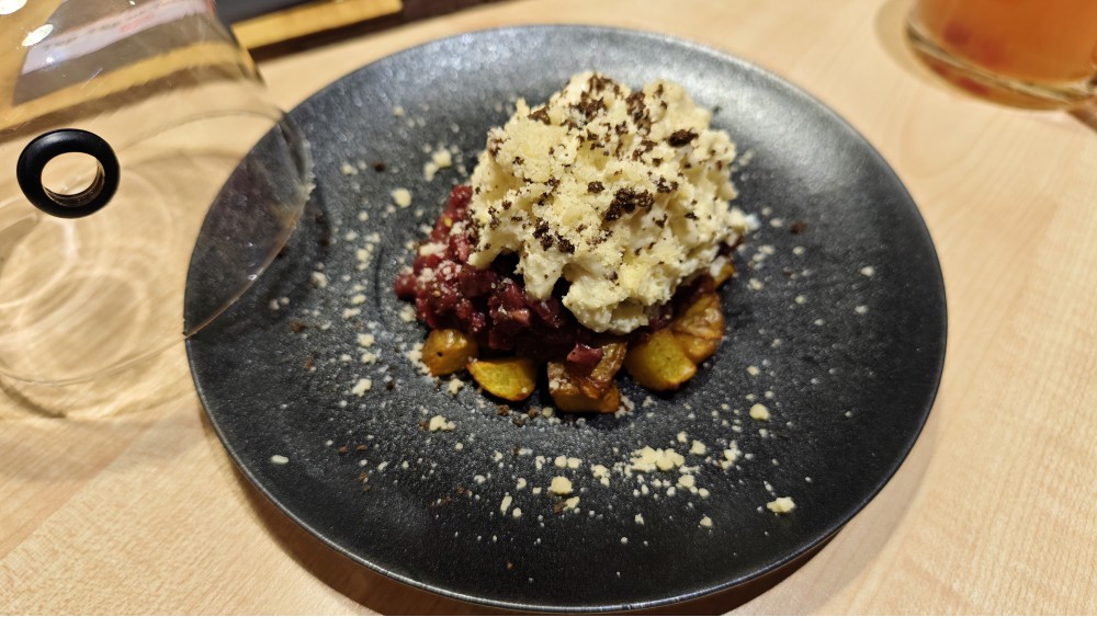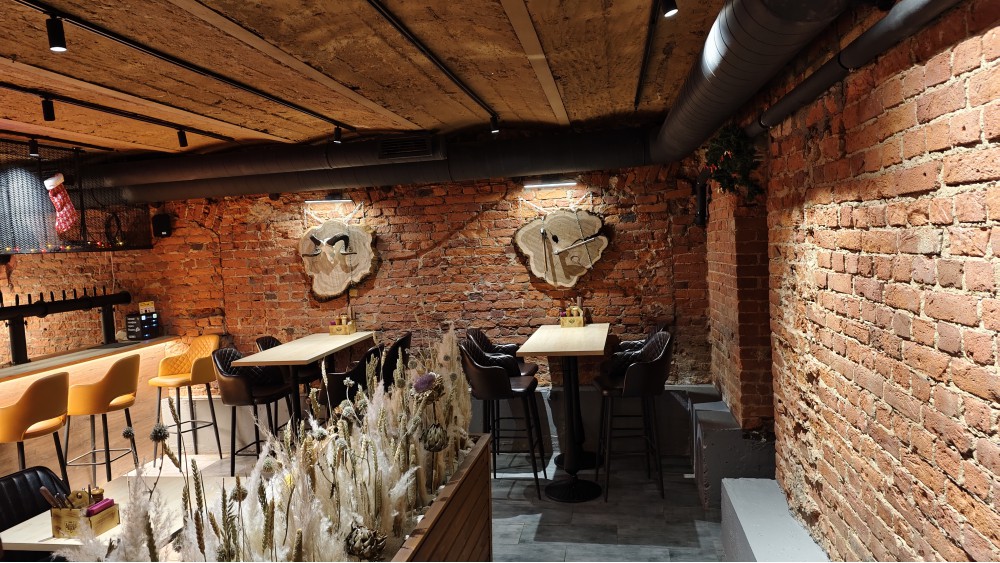 Смелое решение сейчас открываться, это сразу факт: надеюсь, всё продумано хорошо. Но не всё... Даже после всех моих визитов, вот ведь удивительное место, из которого я в первый раз выскочил пробкой. Потому что случился заворот кишок понимания: как может быть? И если так настроен сразу, то и впечатление будет подобающим, лучше покинуть стены. Нигде на фасаде нет времени работы, что, вообще-то, положено — приходится, подойдя к заведению, смотреть в интернете, почему же закрыта дверь: работают с 13.00. Пюпитр поставлен с меню, а этого нет. Работают два месяца, не разобрались с входной группой: каждое открытие двери (а вечером, сами понимаете, часто происходит) поток воздуха в -14, и... меню удерживающая рука замерзает. Понимают, что плохо, что дует даже от стены, противоположной от входа, из-под дивана, и предлагают плед (в одну смену) и принести обогреватель (в другую). Спасибо, но гость пришёл отдыхать, есть не самую дешёвую еду, а не греться чем попало.