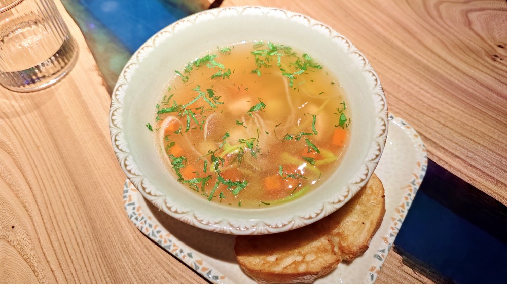 Смотрим печатный вариант: довольно компактное меню, и есть хорошие цены, есть то, что дорого для концепта «итальянское бистро». Даже учитывая почти эксклюзив/монополизм на несколько остановок вокруг, где не знаю ничего современного и выше кофеен-шаверм-пиццы-роллов… Горячие блюда от 1000 до 1690 — это как-то признак не «бистро» на Железнодорожном, пусть и приятного. Бургер теперь 1000, стейк из «какой-то говядины» — 1650. Разумеется, «морожеННое», карбонара на сливках, бургер со страчателлой, пицца — римская с готовыми парбейками, цезарь на айсберге со шпинатом и прочие «счастья». Я перестал ждать от кухни что-либо, да и выбор непрост... Разделы русского меню обескураживают: через пелену лет всё ещё ждут англичанок на «Пролетарской»? Или это писал меню герой «Даёшь молодежь» Данила: «Mors: Mors в ассортименте». Кстати, дорогой морс — 350/стакан, но дешёвая вода: 210/0.5 Чай по 390, кофе 250.