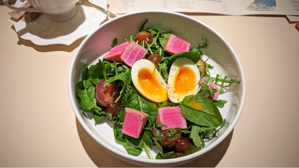 Интерьер милый, для кондитерской или заведения с завтраками было бы вообще шикарно. Для гастробара, наверное, чуть слаще, чуть «розовее» — в переносном смысле, после K-bakery — ожиданий. Жаль, сложно сфотографировать нормально: центральный стол под офисом на два ноута, и там вечно два начальника, оба визита, днём и вечером. Больше, чем гостей, тут персонала, даже после моего прихода. Отличные диваны (пишу один раз в 37 серий), строгие металлические стулья, но с подушкой для всего вашего ценного, свет на крепкую оценку «4». Гардероб в зоне входа, и вот в зале только приятные (раздетые) люди. Но мне не судьба остаться.