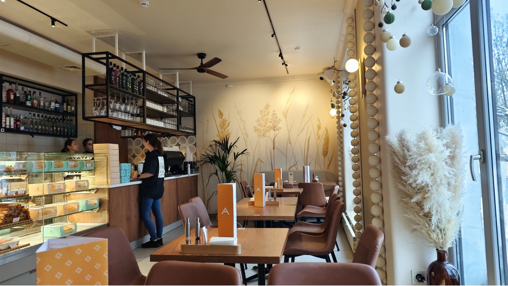 Центральнее и удобнее некуда: одна из двух важных и параллельных улиц, все видели, на пути от Вокзала к Кремлю, почти у Областной Администрации, Главной Площади и Памятника Ленину. Высокий первый этаж, русскоязычный вариант вывески, хорошо смастеренный вход и зона приёма, гардероб для гостей. Помещение буквой Г, где как раз на углу узел кассы и заказа: вошедшему сразу понятно, куда пришёл и что делать! Ждать хорошего, несмотря на демократичность формы торговли — витрину кондитерскую, и проще выбирать на вид, основной заказ у кассы, номер — и приносят за стол. Есть «терминал самообслуживания» удобный, я какие-то факты узнавал из него — проще, чем спрашивать. Посадка одинаково комфортная и в основном ряду у окон, и в «вертикальном» ряду: стулья от Deephouse везде, везде «точки» над столами, что недвижимы и надёжны, успел опробовать несколько. Все с отверстием под стойку для пиццы — хорошая экономия места, учитывая размер местной «римлянки». Гладко, спокойно, «на каждый день», но с запоминающимися элементами, как вертикальные штанги с деревянными шарами или цветочные мотивы на стенах. Конечно, полноценный ресторанный туалет. Да, туристам важно!