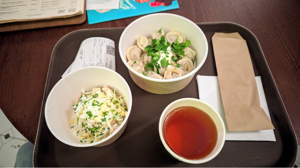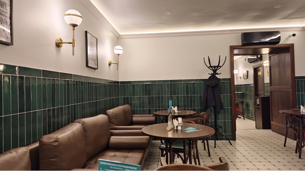 В том первом разговоре выяснилось, что работающая около года пирожковая «Совторг», как часть помещения бывшего ресторана «Санкт-Петербург»/«Бархан», слева от входа, это детище того же владельца с недетским тщанием. Логичный успех: сколько проходил мимо, всегда видел почти полный зал и небольшие очереди к кассе: туристам на канале Грибоедова надо перекусить, недолго посидеть, отдохнуть летом или погреться зимой, допустим, пятнадцать минут, а не есть в ресторане первое-второе-компот. Тут совсем другой концепт, основанный на советских рецептах, а не зумерской ИГРЕ в советское наших новых рюмочных: ковры, хрусталь, газеты, Брежнев, столовые приборы с пластиковыми ручками. На самом настоящем продукте, а не антураже.