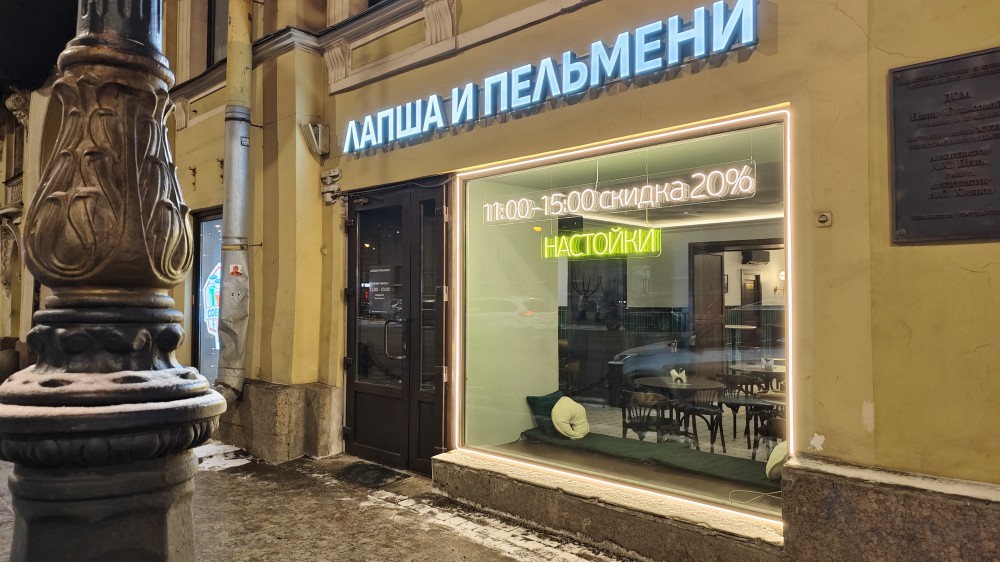 Уникальный для меня случай в почти уникальном месте. Стало быть, шёл я мимо после ужина в другом заведении — гулял, панимаш. Увидал новую вывеску на Литейном, недалеко от светофора им. Белинского: «Лапша и пельмени» и под ней «Настойки». Подошёл, заглянул в окно — понять формат, и тут три мужичка, что курили у входа, заговорили: «Очень вкусные пельмени». «А вы пробовали?» «А я владелец». Я и зашёл. Проболтали час, до и после еды, с трудом не дал себя угостить — и пельменями, и настойками, я слишком уважаю труд людей. Потом ещё два раза ходил в кафе, что открылось месяц назад. Так что сегодня смесь рассказа не моего, про идею и воплощение, и моих впечатлений.