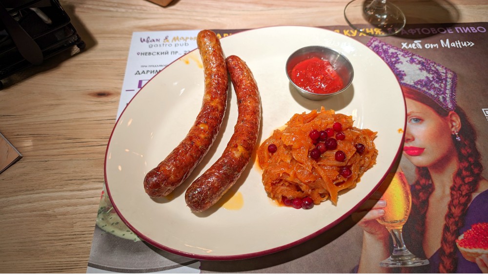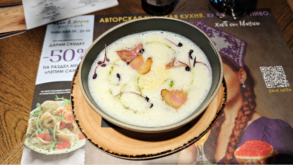 Прочитал у себя, что гороховый суп стоил в 2010 году 190 рублей — сейчас 570: инфляция, Эльвира Сахипзадовна, ровно 200%! И средний счёт чуть более 2000. Большое меню, но «Рыбы по-баварски в слоёном тесте» очень хочется, хоть это явно не тестовое блюдо. Размер предложения, по сравнению с брассери на В.О., чуть меньше хвалим. Зал-то компактнее, и он один, мест меньше — вот зачем четыре тартара в закусках, шесть колбас (даже у немца!), помимо остальных разделов? Я бы пятую часть точно срезал, но заведение не новое, видимо, знают гостей в центре, знают мощности кухонные. Тем более вокруг сменились по три раза вывески/владельцы, а тут Глыба и Постоянство. Псковский Живой квас (490) от Пивоварни Купца Лапина, не один же морс пить по сети, пусть и знатный.