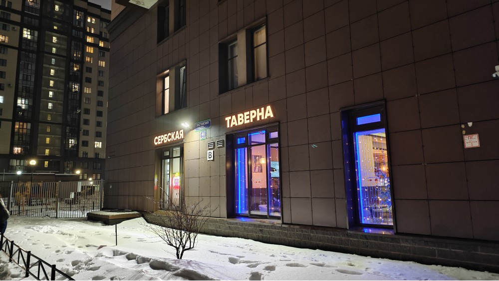 Таверна, но интерьер скорее не самой большой кофейни-кондитерской, ещё и витрина с десертами, в которую упирается взгляд от входа — кроме картин, условно сербских, безликий. Въехали в помещение закрытого кафе? Ужасная всегда, но хоть понятная в туристическом центре, тут, в самом закрытом от случайных гостей комплексе, совершенно неуместная надпись: «Туалет только для посетителей». В целом я бы не ругал, но Таверна у меня — это нечто другое, не только цели визита, но и антураж, что работает на впечатление. Таверна — например, выборгские заведения под сводами, наша «Гролле» на жирный конец, она, пусть и не эталон. Тут — реальное еврокафе в новом большом ЖК, а не в потрескавшемся домишке, где каждая трещина в стене — история. Еврокафе, куда завтра может въехать пиццерия или «японка», не меняя ничего.