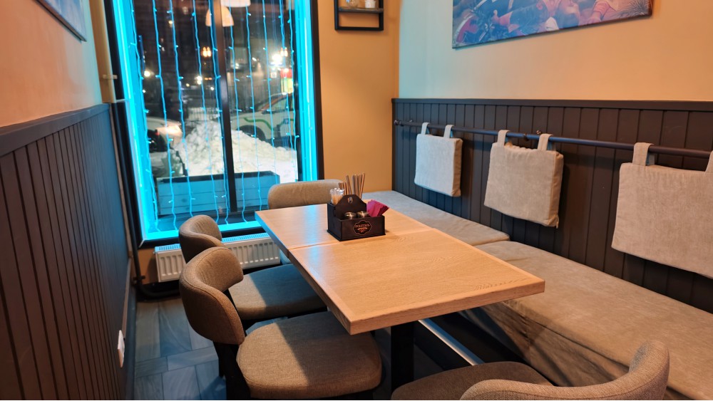 Пятница вечер — никого! Это показатель для места в большом ЖК: даже местным не надо или так совпало случайно? Так что всё внимание, я требую, моё! Сервис на грани «первый день в общепите». Тихий голос, интеллигентно, но как же приходится напрягаться. Как можно переспрашивать четыре раза продиктованное чётко и записанное в блокнот? И приходится всё повторять. Втюхивание двойного морса, при указанном в меню размере 0.2 литра, в небольшом гастробаре — это в пять раз страшнее преступление, чем в сетевом «Иване». Дешёвый морс, да, 130, но как разведённый. Лучше купить чай (290). Или пиво — нет лицензии.